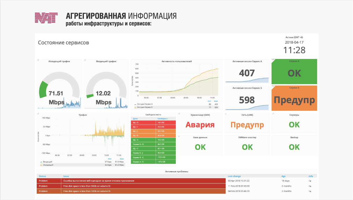 Подключение сервера к eAdmin позволяет оперативно получать информацию о работе оборудования, отключении оборудования или поломке. Система мониторинга хранит ключевые параметры работы сервера (загрузка процессора, память) в течение одного года, данная информация позволяет эффективно планировать затраты на модернизацию серверного оборудования.